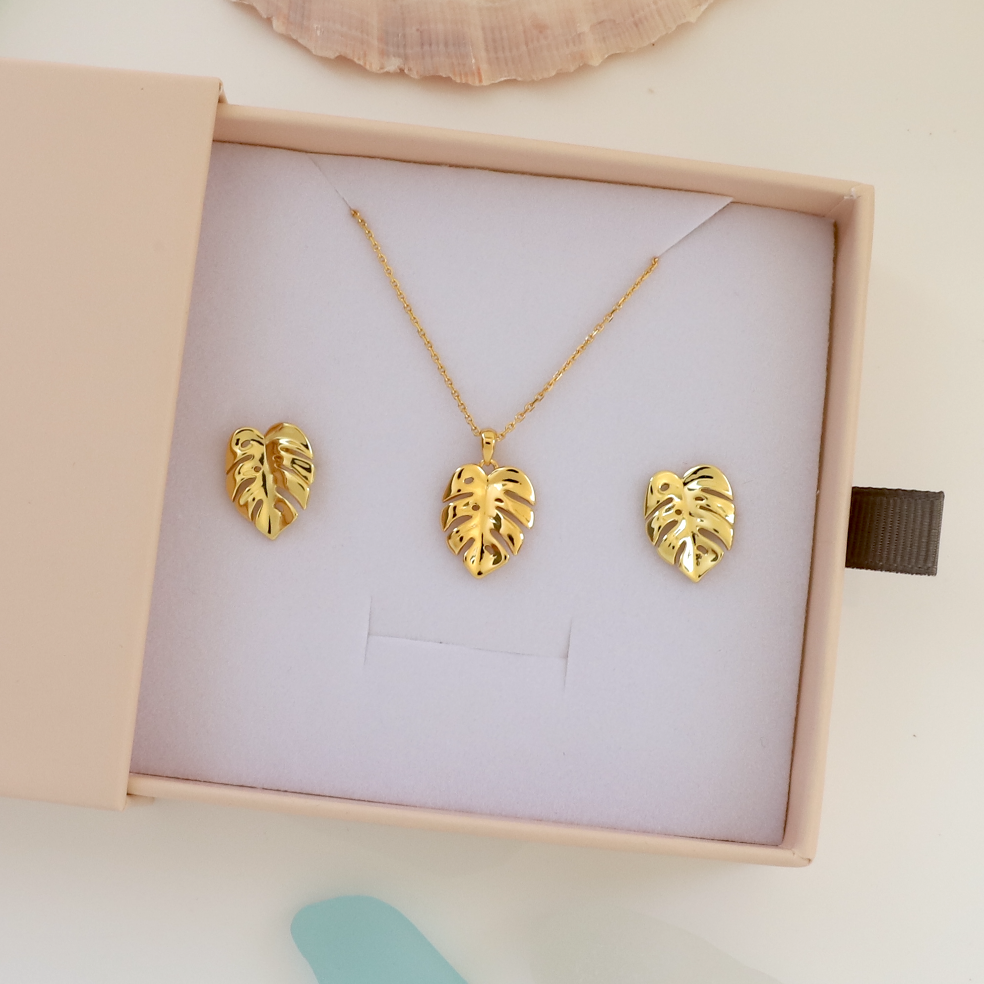 - This set is includes a beautiful Monstera Necklace and a matching pair of Monstera Stud Earrings