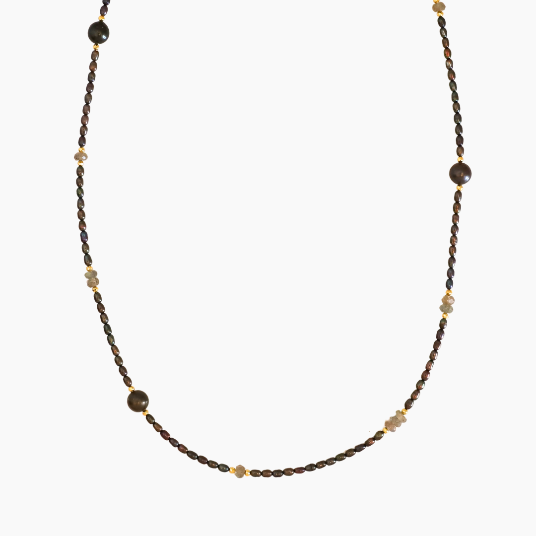 - This necklace features Peacock Freshwater Keshi Pearls, gold pyrite accents, labradorite gemstones and Tahitian Pearls