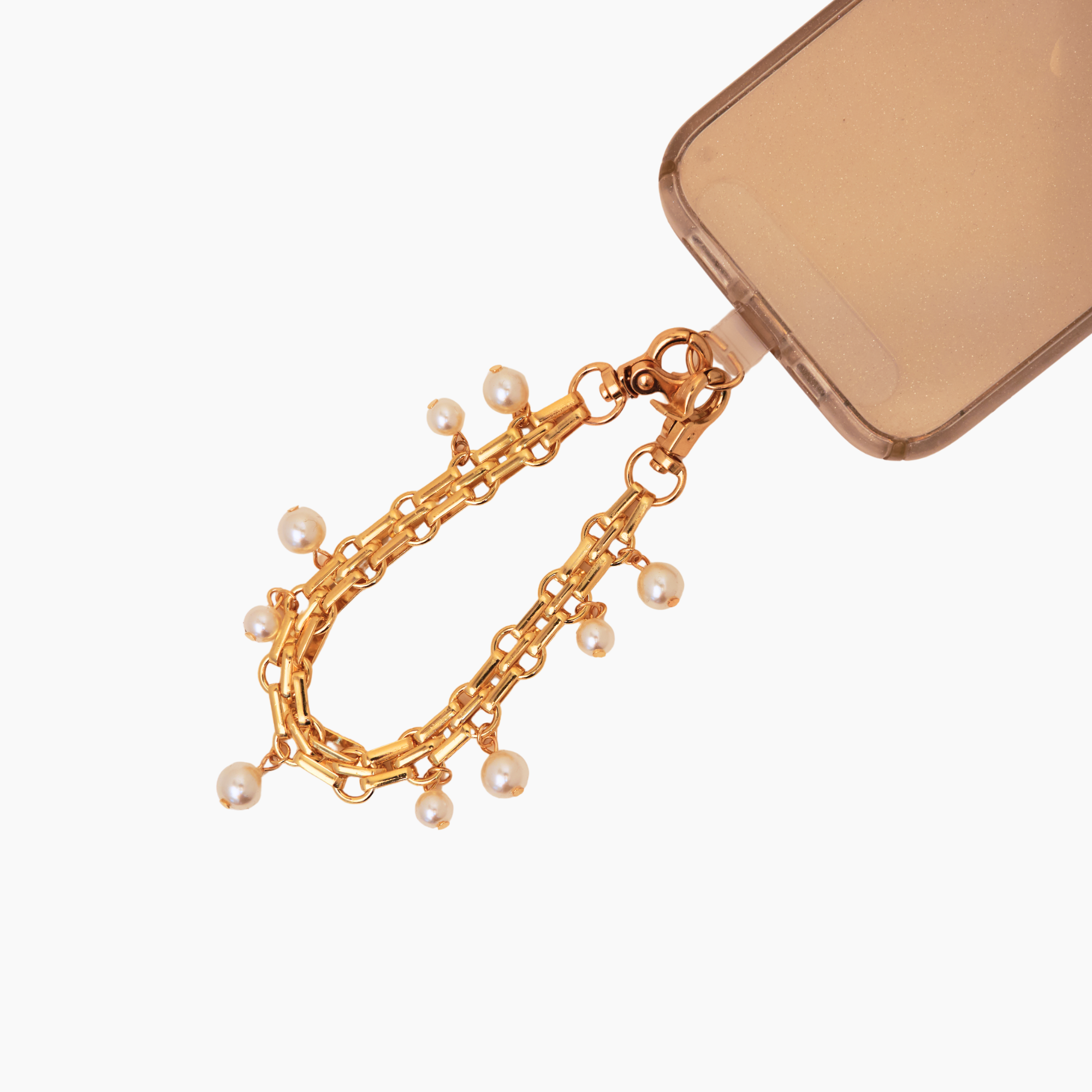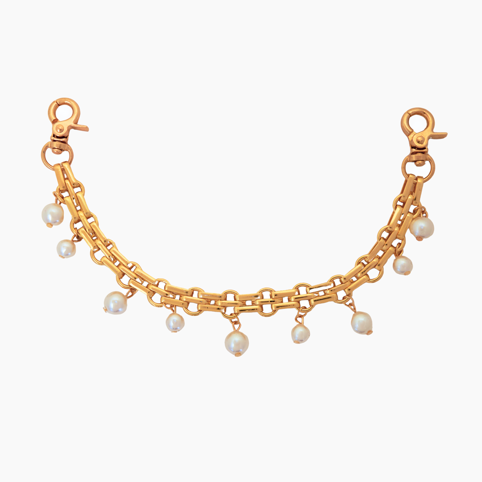 Add a touch of jewelry to your bag! This beautifully designed gold chain features nine dangling white faux pearls, creating a chic and elevated look for your purse or tote