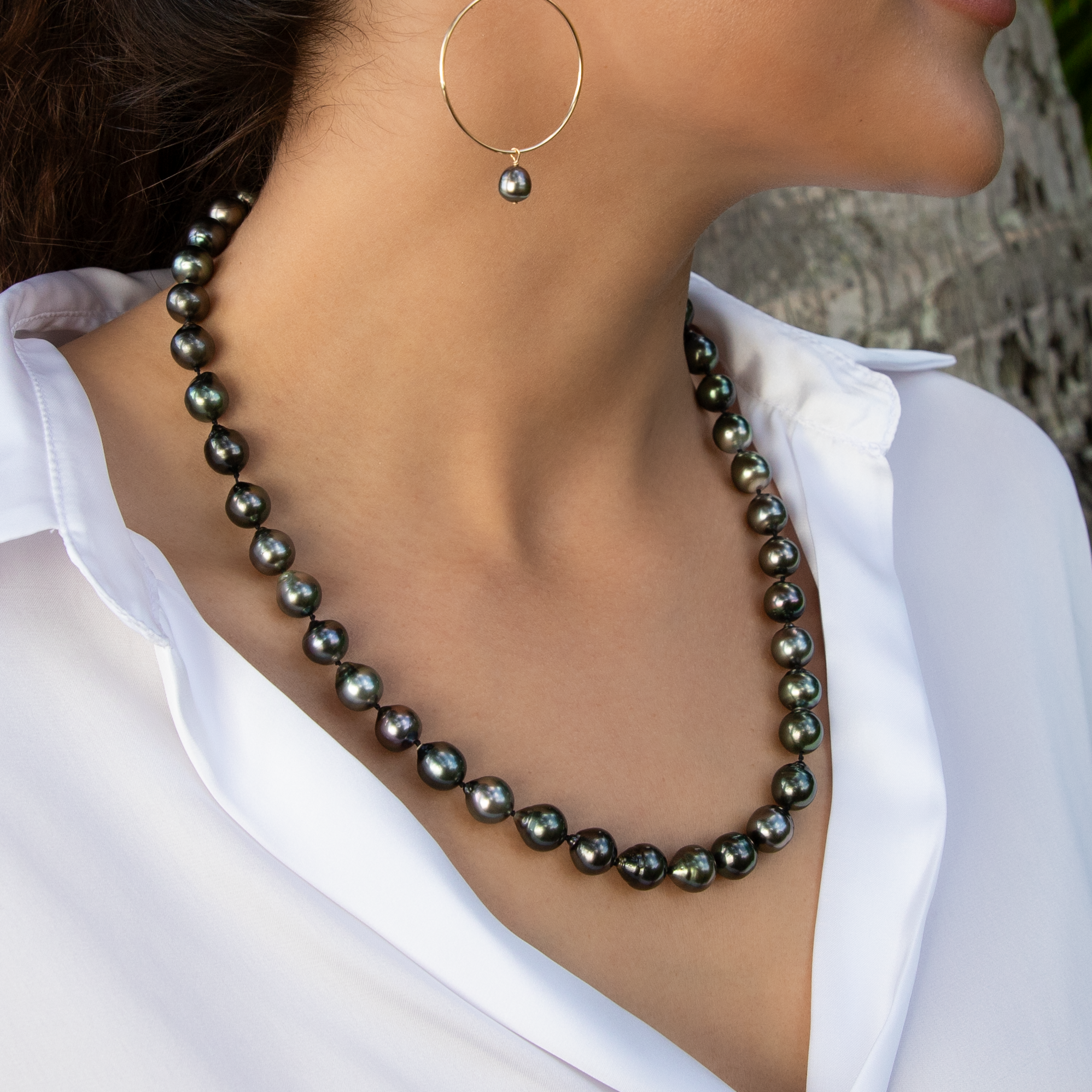 An exquisite statement of elegance, featuring semi-baroque Tahitian Pearls in deep, dramatic hues. With their rich dark peacock tones and flashes of aubergine, these pearls captivate with their natural luster and refined beauty.