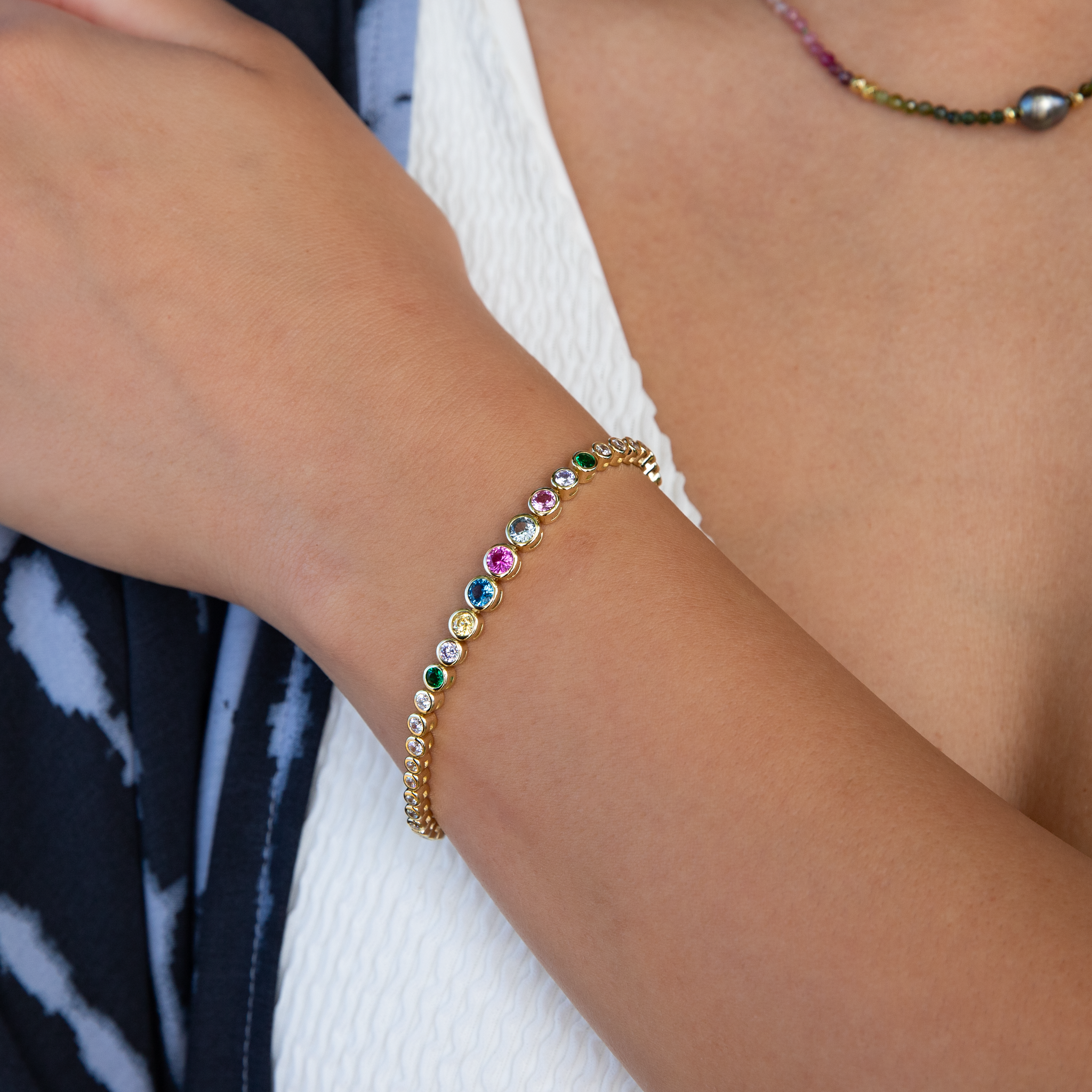 Made with beautiful bezeled rainbow cubic zirconia gemstones graduating from small to large: Peridot CZ, Pink Tourmaline CZ, Aquamarine CZ, Dark Pink CZ, Blue Topaz CZ and Citrine CZ