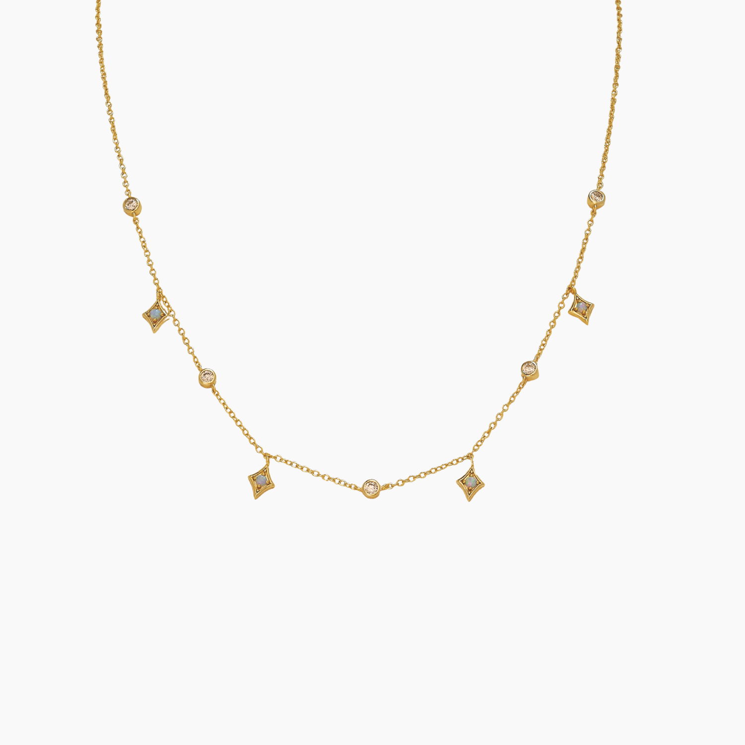 Four Opals and five Cubic Zirconia are set in this beautiful necklace